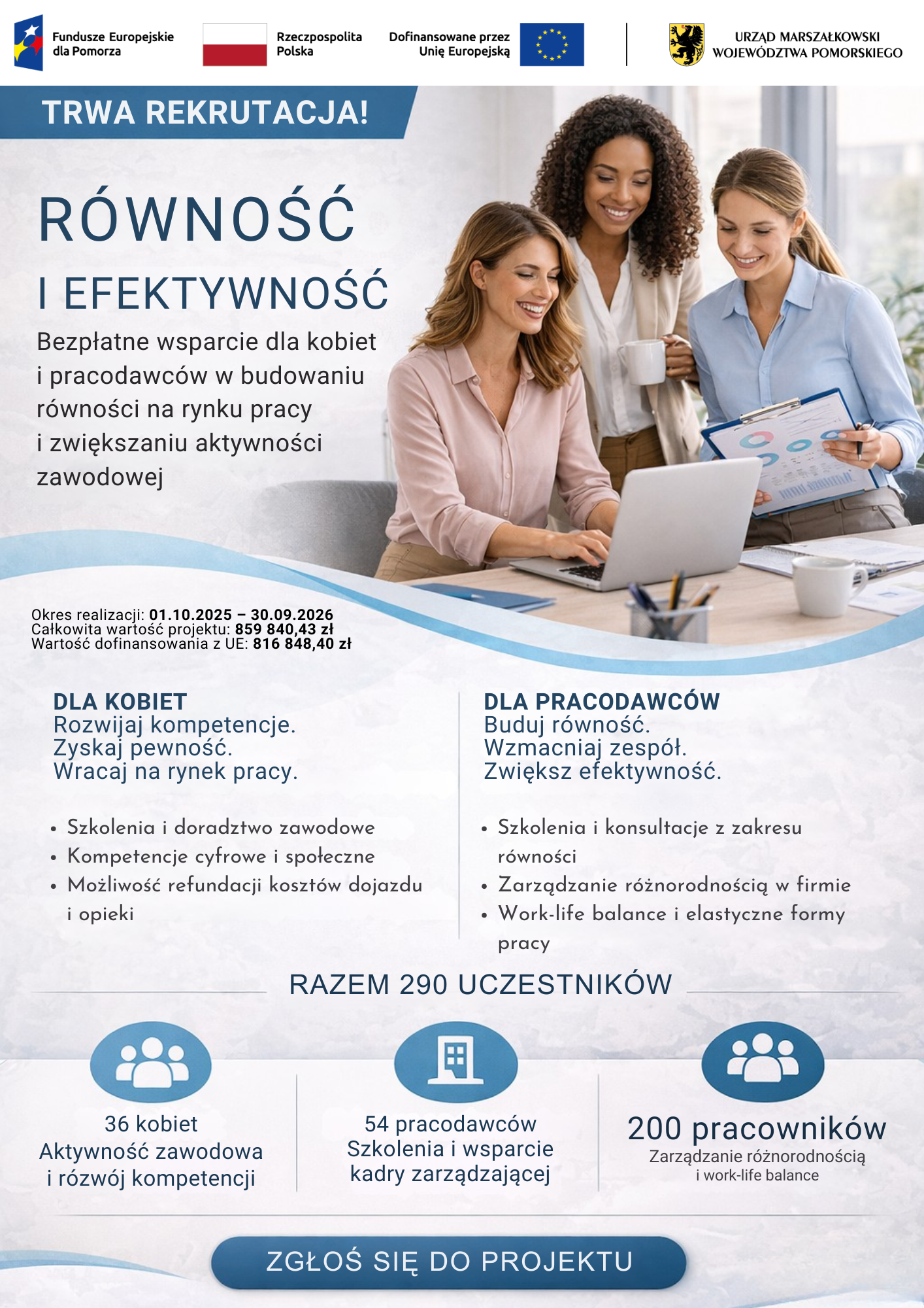 Projekt odpowiada na bariery w dostępie kobiet do rynku pracy, szczególnie na obszarach o ponadprzeciętnym poziomie wykluczenia społecznego w województwie pomorskim.